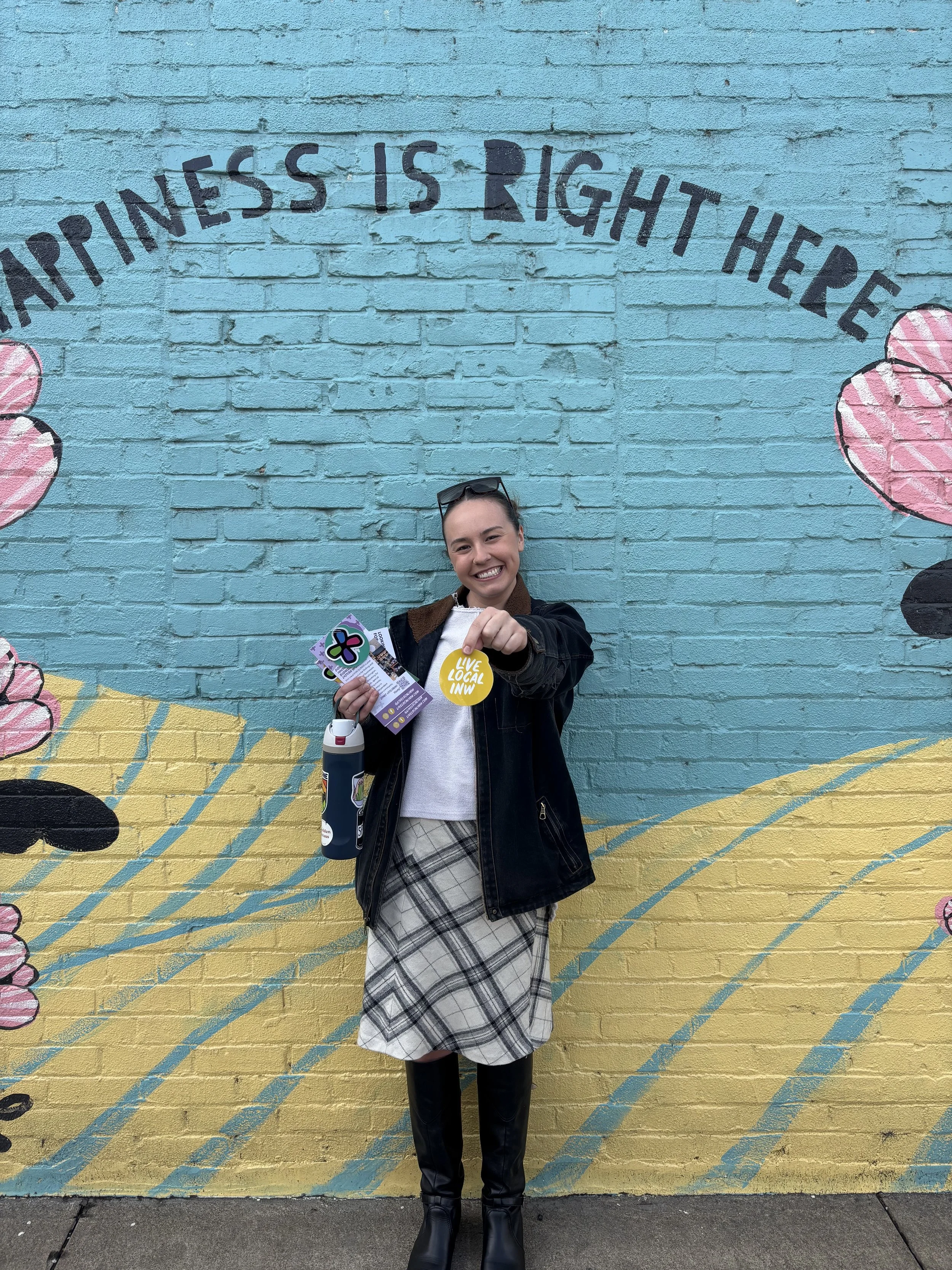SIMBA staff conducted outreach in Colfax and Pullman this month, spending the day connecting with small businesses and distributing SIMBA and Live Local INW materials, along with the three required L&I posters. Pictured is Emily Phelps in front of a beautiful mural in downtown Colfax.